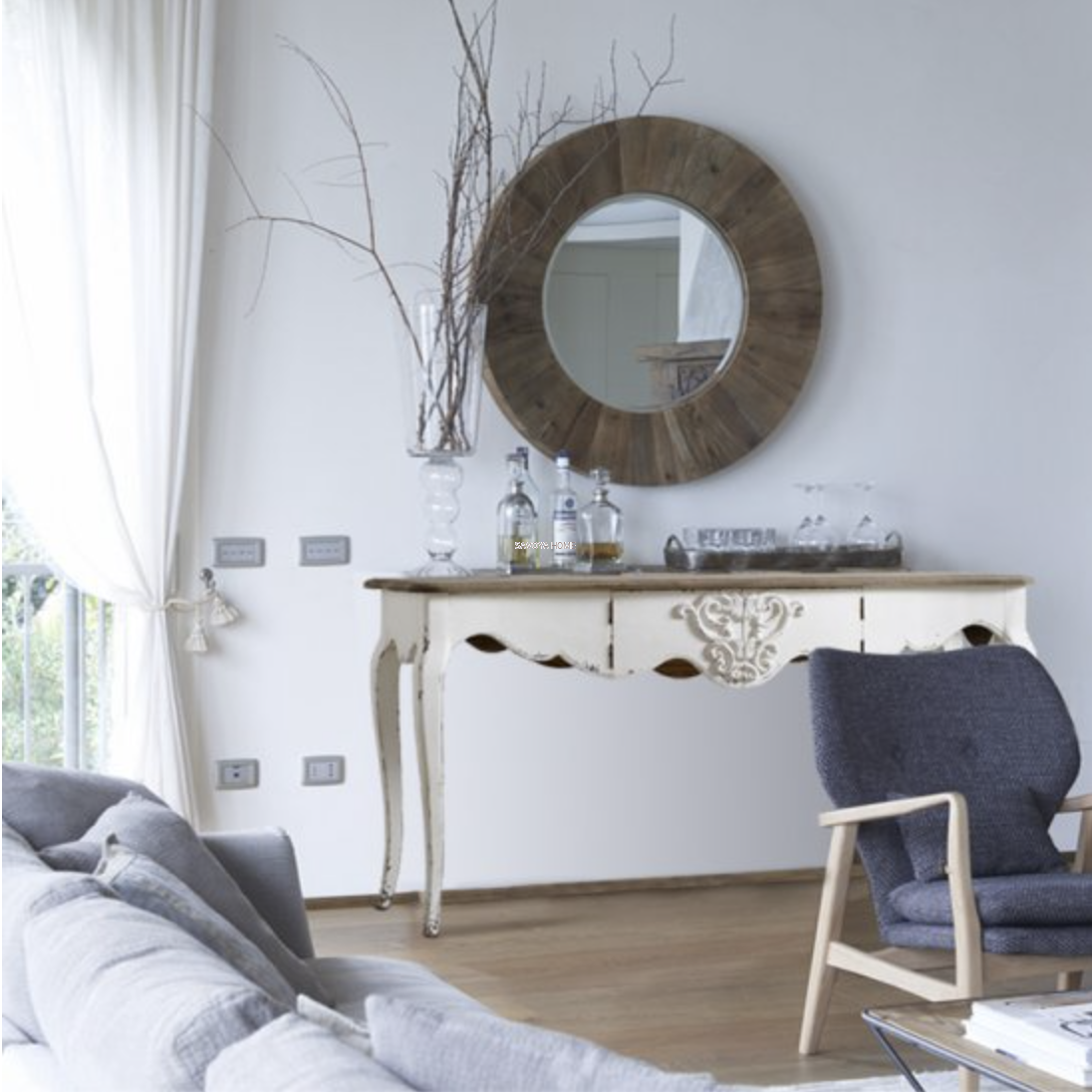 Konsola z centralnym otwieranym schowkiem, w lakierowanym drewnie wykończeniu Bianco Vissuto, dębowy blat w wykończeniu Vintage Chiaro.