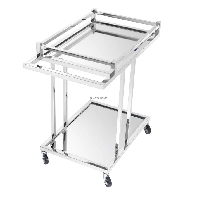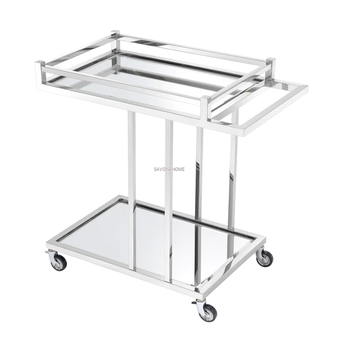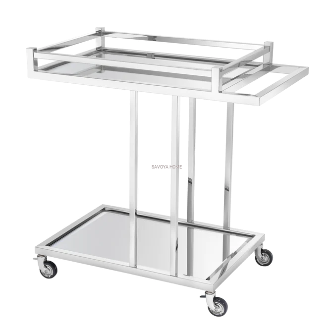 Nadaj swojemu domowi odrobinę hollywoodzkiego blasku dzięki wózkowi barowemu Beverly Hills Trolley. Ten oszałamiający mebel składa się z eleganckiej ramy z polerowanej stali nierdzewnej i frezowanego lustra. Idealny dodatek do serwowania drinków i koktajli, łatwy do przemieszczania dzięki kółkom i eleganckiej rączce, który nada niezwykłego uroku wnętrzom w stylu glamour.