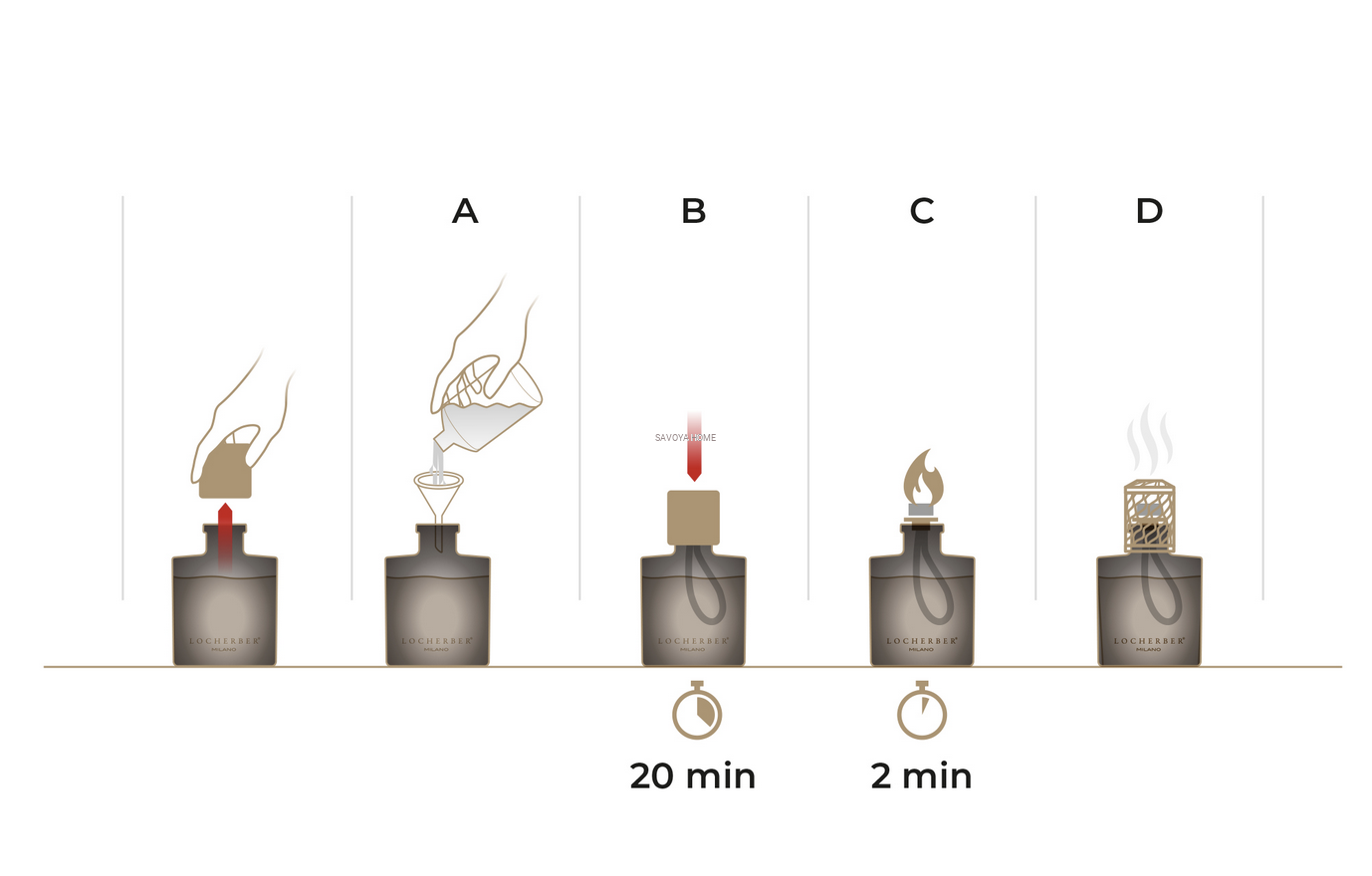 Umieść lampę na płaskiej, stabilnej powierzchni, z dala od źródeł ciepła. Zdejmij pokrywę katalizatora i wlej wkład do lampy za pomocą dołączonego lejka, napełniając ją do około 2/3 wysokości. Włóż katalizator z knotem do lampy. Przed pierwszym użyciem pozostaw knot w esencji na około 20 minut. Zdejmij nakrętkę, zapal katalizator i pozwól płomieniowi palić się przez około 2 minuty. Zdmuchnij płomień i załóż perforowaną nakrętkę. Lampa jest teraz gotowa do użycia.