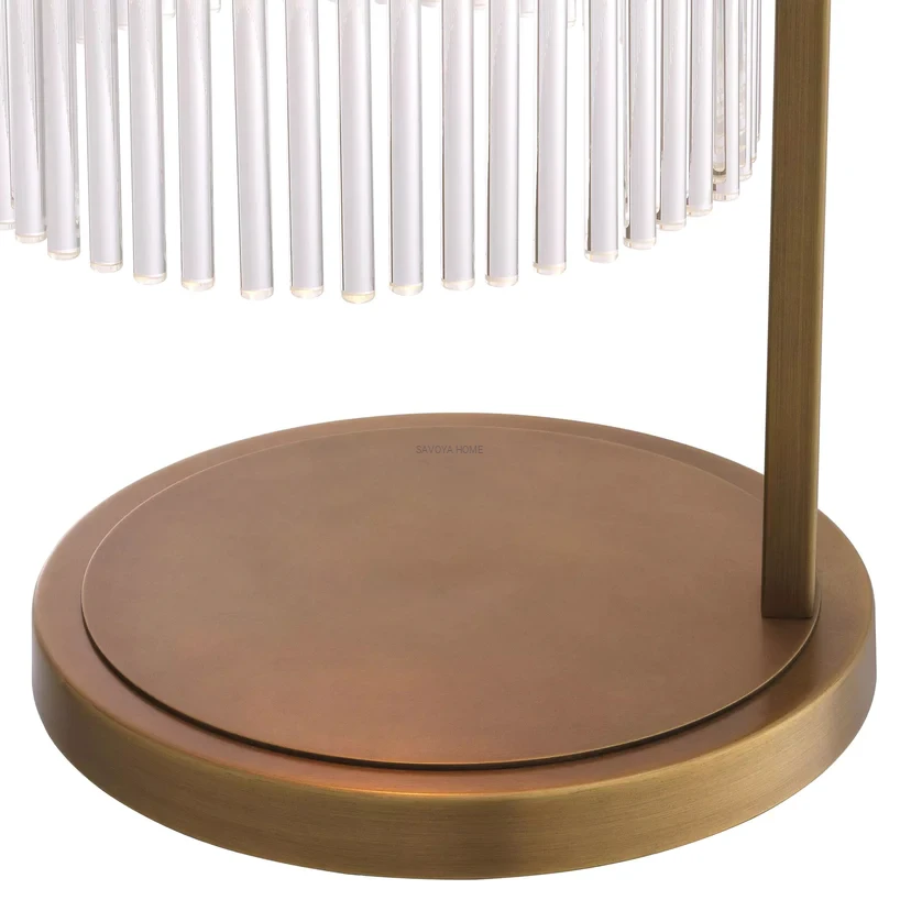Podstawa lampy stołowej Eichholtz Carnero wykonana jest z antycznego mosiądzu, a abażur składa się z wielu cienkich, szklanych pręcików.