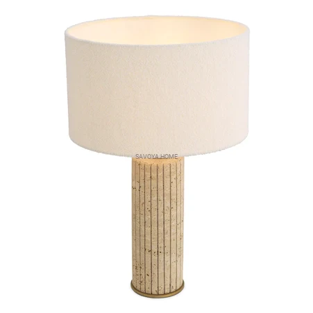 Wykończenie: antyczny mosiądz, trawertyn, abażur w tkaninie bouclé cream