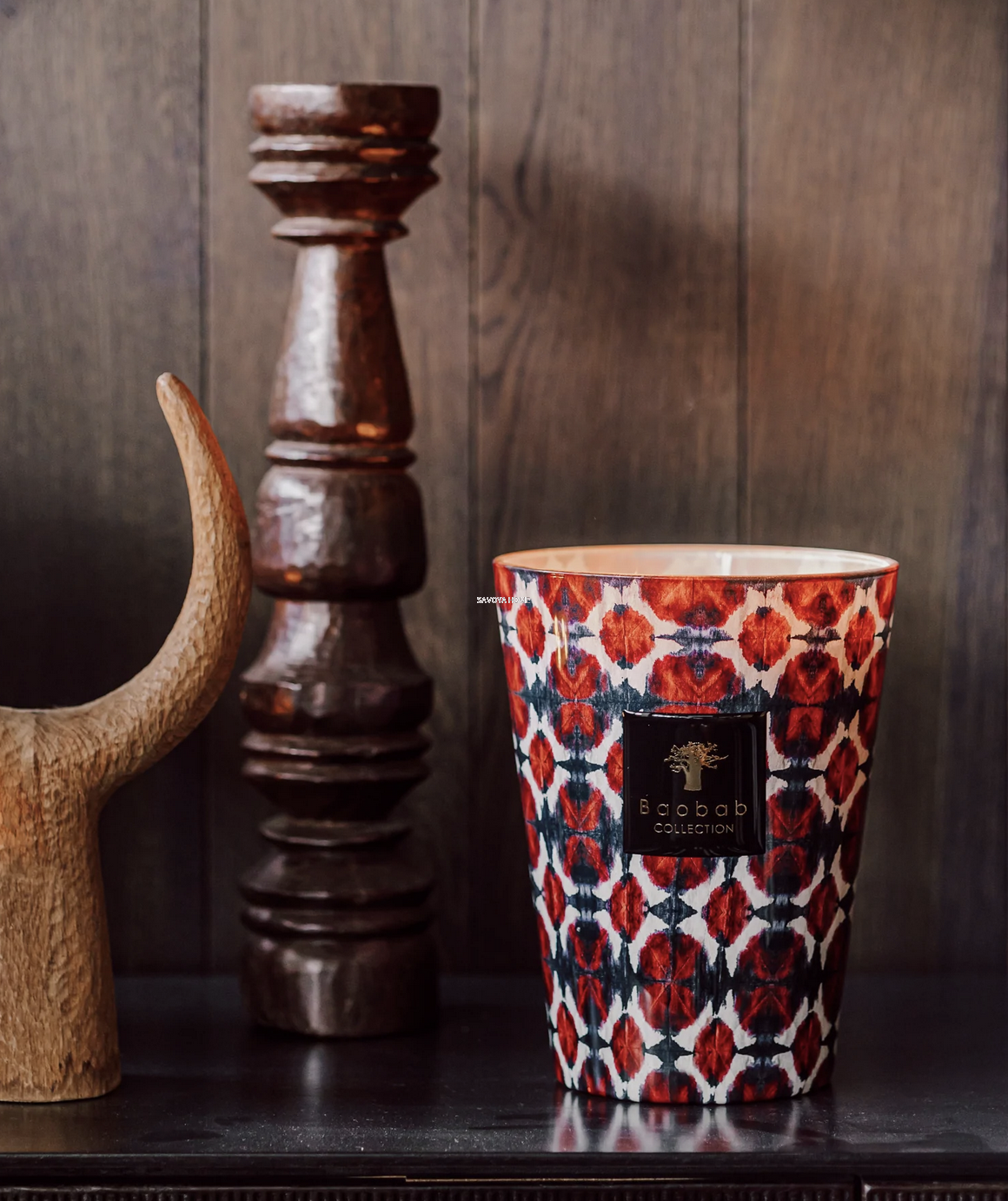 Świeca Django z prześwitującym dekoracyjnym czerwono-czarnym nadrukiem, delikatne aromaty bursztynu i cynamonu z zapachem przywołującym na myśl miękką, kaszmirową wełnę , jednymi z pierwszych perfum, w których zastosowano Cashmeran jest legendarny zapach Loulou marki Cacharel z roku 1986