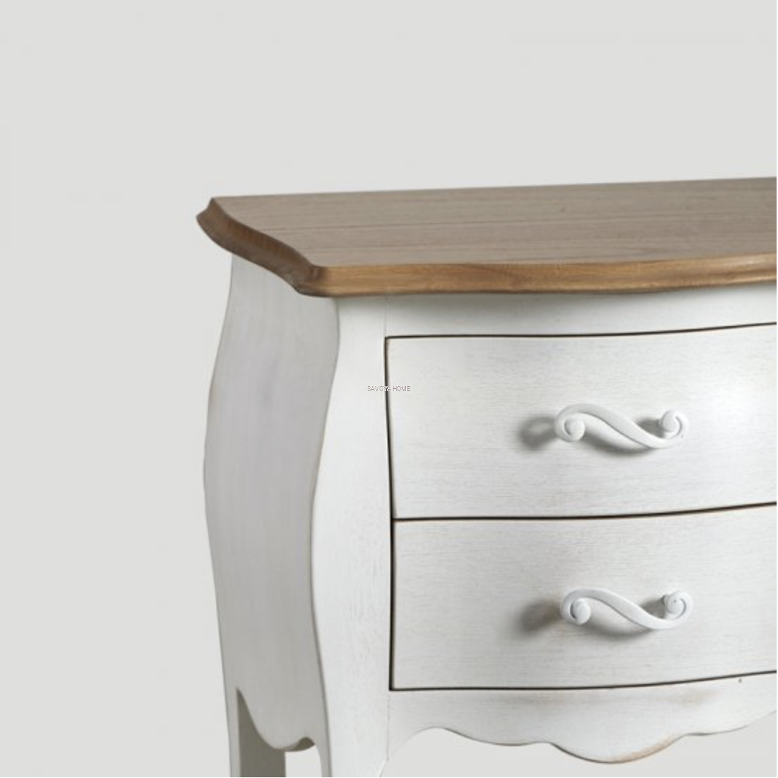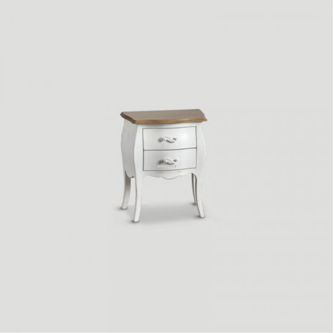 Szafka nocna z 2 szufladami z drewna, lakierowana w kolorze Antiqued White, blat z dębu z wykończeniem Natural.