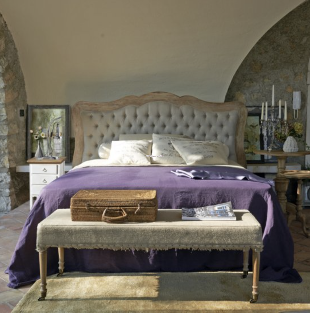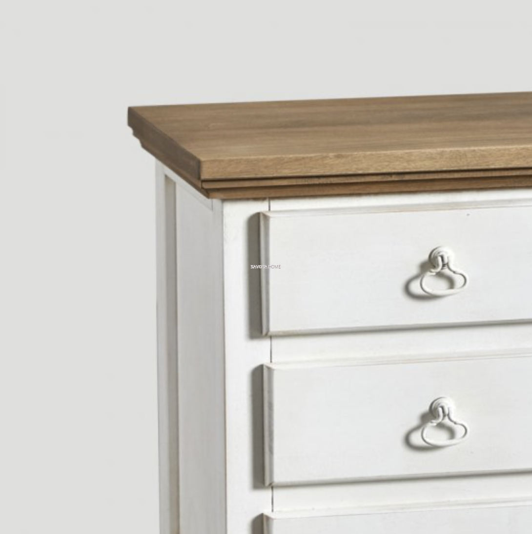 Drewniany stolik nocny z 3 szufladami, lakierowany w kolorze Antiqued White, blat z dębu z wykończeniem Natural.