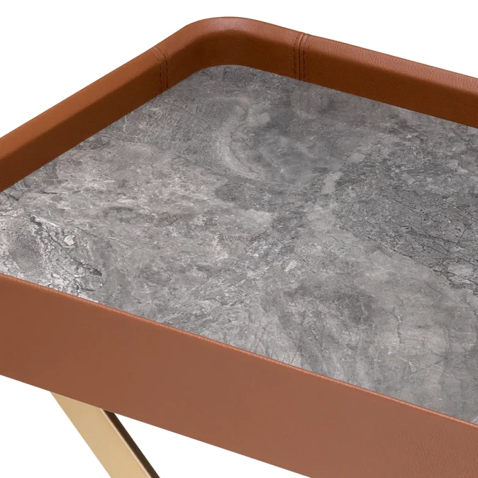 Wykończenie: szczotkowany mosiądz, brązowa skóra, spiek o wyglądzie szarego marmuru