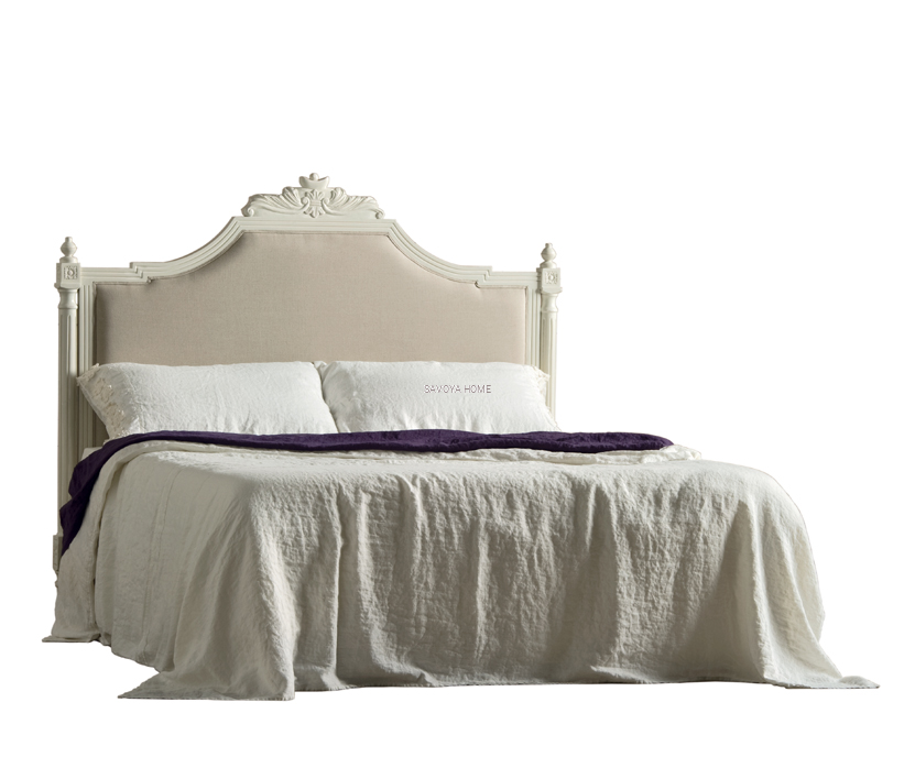 Tapicerowany zagłówek do podwójnego łóżka, drewniana rama lakierowana w kolorze Bianco Vissuto, pokrowiec z lnianej tkaniny w kolorze Ècru.